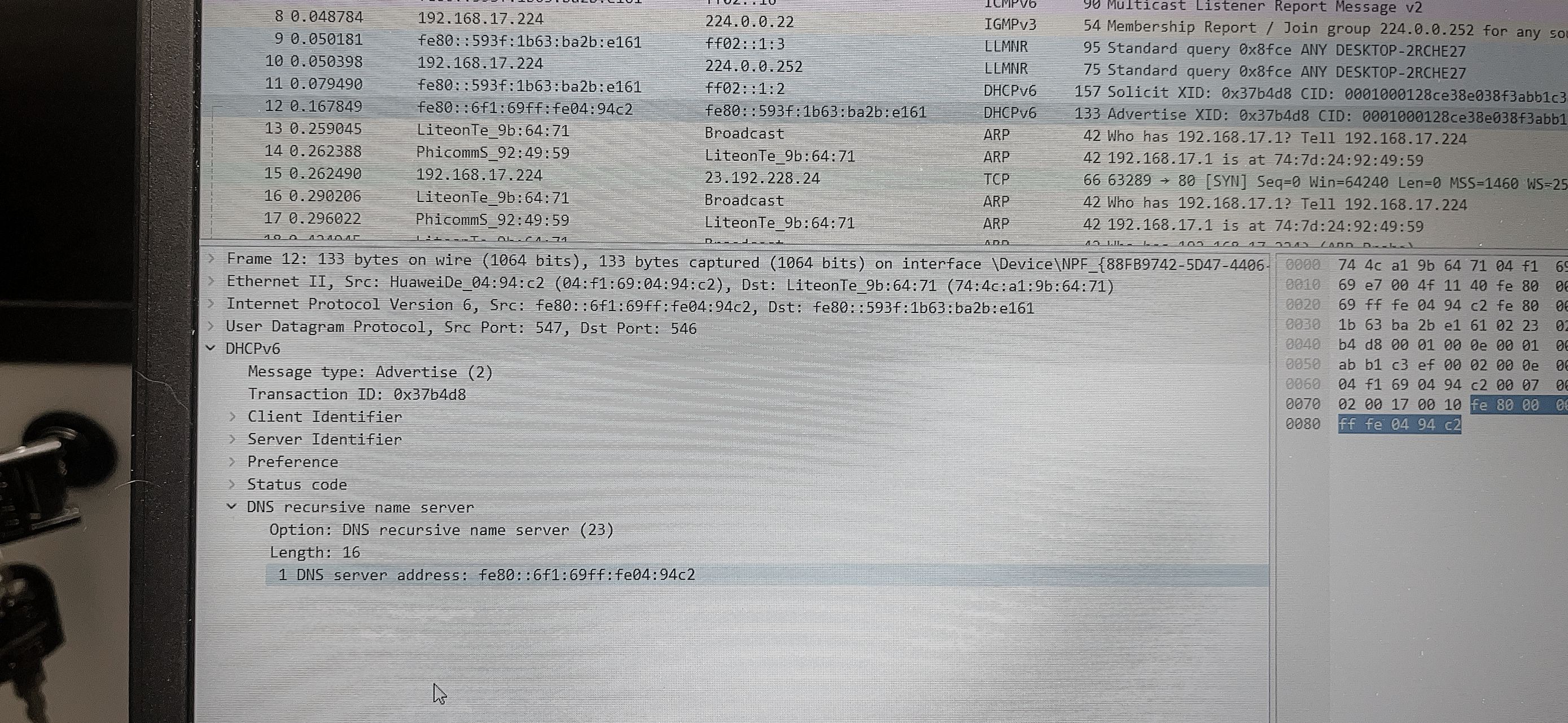 好吧,再回去抓包,这次在出现 IPv6 地址后,停止抓包,准备从上到下把 100 多个包全部捋一遍,顺利发现了,Windows 会主动发送 DHCPv6 请求,并紧接着有响应包,里面正好包含那个该死的 DNS 服务器,看设备名,HuaweiDe_04:94:c2。