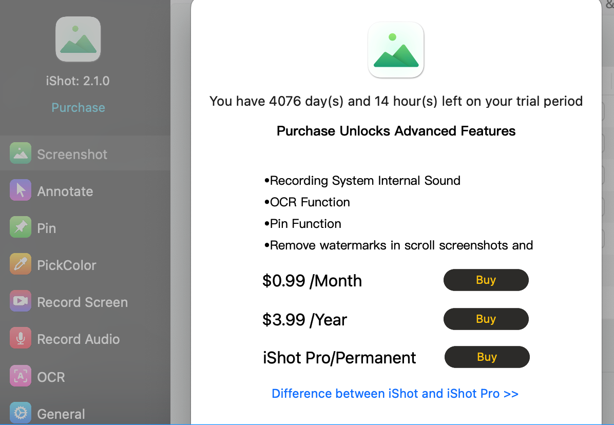 近期 iShot 推出了 2.0,新增了不少功能,其中部分是收费的,包括一些老版本的免费功能,截止到 2.1.0,仍可以通过指令把试用期拉到数千天以永久免费试用: